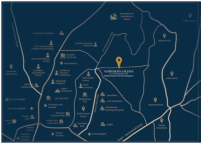 Northern Lights - A New Landmark in North Bangalore Located in the rapidly developing hub of Bagalur, KIADB, Northern Lights offers a premium lifestyle sanctuary spanning a massive 25-acre land parcel. Designed for those seeking luxury and convenience, the project features high-rise towers (2B + G+30/31) housing over 2,600 Vastu-compliant units. Residents can enjoy an expansive lifestyle with 80% open space and a colossal 1,00,000 sq. ft. clubhouse hosting over 50 luxury amenities. The distinct architectural design ensures high privacy with no common walls and an impressive 75% carpet area efficiency. Strategically positioned for excellent connectivity, Northern Lights is just 6km from the International Airport and sits within a stone's throw of major employment hubs like the KIADB Aerospace SEZ, Boeing, and SAP Labs. With configurations ranging from 1 BHK to 4 BHK and competitive pricing starting at just ₹65 Lakhs, this project stands out as one of the most value-driven investment opportunities in North Bangalore.